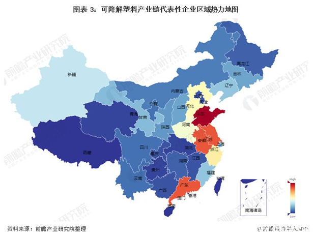 2、中國可降解塑料產(chǎn)業(yè)鏈區(qū)域熱力圖:目前企業(yè)生產(chǎn)規(guī)模普遍較小,市場集中度有待提高